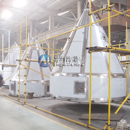 離心噴霧干燥機干燥室的形狀、大小與霧化器的形式、空氣分布器、尾氣排出管、排粉方式有關(guān),取決于乳品的性質(zhì)和對制品的要求。乳品干燥中主要用:垂直下降并流型。這種形式的的熱和氣流和液滴相接處,雖然氣流溫度高,其熱量都供給水分蒸發(fā),實際液滴表面溫度接近濕球溫度,故仍能保持物料原有的特性。