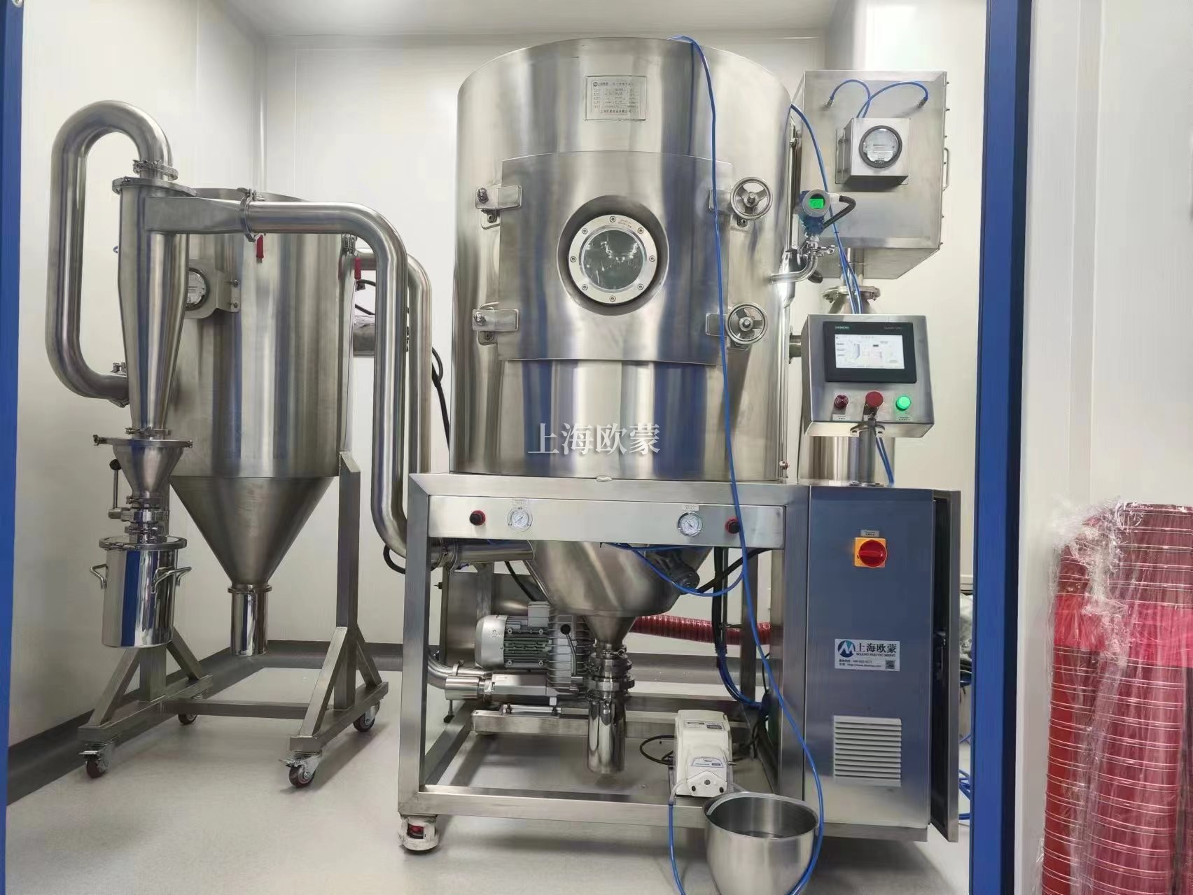 噴霧干燥機為開式循環,并流式,離心式霧化。干燥介質空氣經過初、中效空氣過濾器過濾后根據操作指令由鼓風機吸取再經加熱器加熱通過高效過濾器的熱風分配器進入噴霧干燥主塔。液體物料根據操作指令經過蠕動泵,進入高速旋轉的離心噴頭,在離心力作用下被分散成小霧滴。在噴霧干燥主塔內,小霧滴與熱風在充分接觸,沿其特定路徑進行熱交換后被干燥成為產品,然后通過旋風分離器實現分離,固體物料被收集,氣體介質再經過過濾后被排出。整套噴霧系統易清潔、無死角,符合GMP要求。
